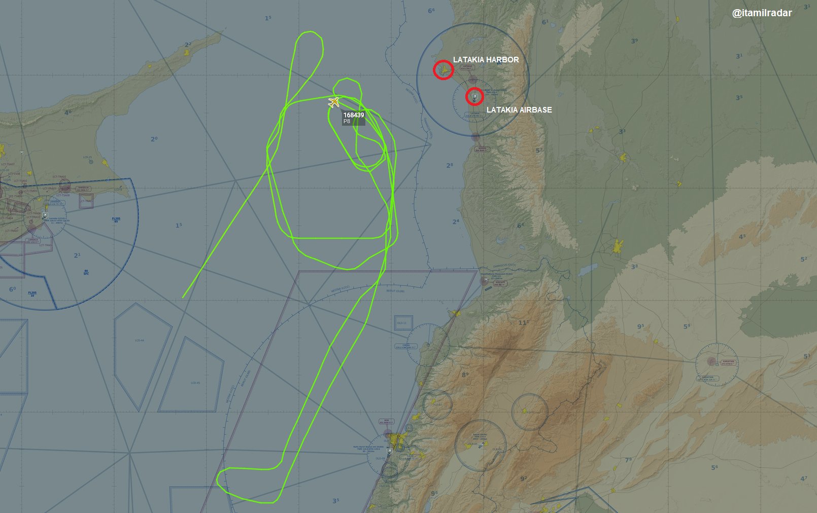 US Navy Boeing P-8A (168439) has been dispatched from NAS Sigonella making surveillance mission off Syria’s coast, near Latakia Russian bases (harbor and airbase).